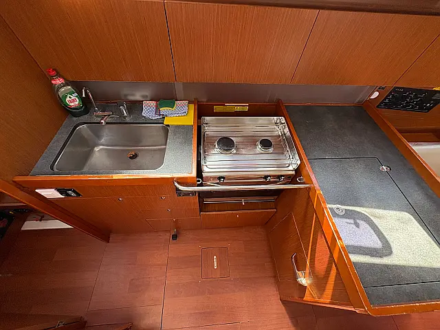 | Equipment: | Binoculars, Torch, Fenders (7), Charts, Rubber, Divider, Tool box, Kitchen equipment, Bosuns chair, Winch handles, First aid, Swimming platform, Gas bottle (2), Dinghy, Shore power cable, Life jackets, Sprayhood, Autopilot, Cockpit cushions, Wind station, Echo sounder, Cockpit shower, Bimini, Lazy bag, Furling genoa, VHF, EPIRB, Compass, Fire extinguishers, Liferaft, Mooring lines, Swimming ladder, Fire extinguisher, Flares, |