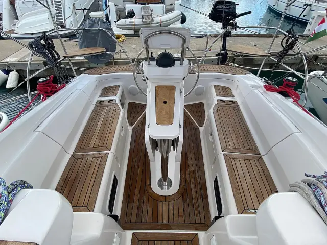 | Deck: | Bimini top, Teak cockpit, Cockpit table, Sprayhood, Cockpit stern, outside shower, Dinghy, Electric anchor windlass, |